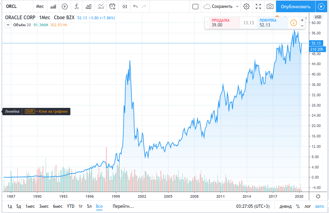 Ценовой график акций Oracle говорит нам, что компания, основанная ещё в середине 1970-х годов, всегда находила способы адаптироваться и даже предвосхищать события, получая преимущества перед конкурентами.