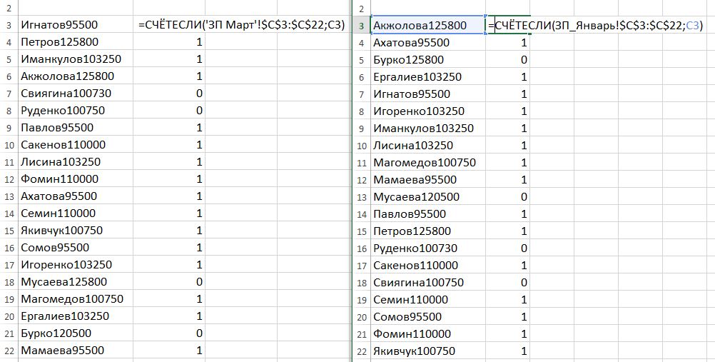 И уже значение этого столбца можно сравнивать между собой. К примеру, можно применить функцию счет если. Она подсчитает вхождения значения одного ключевого столбца в другом. Напомним ее синтаксис.