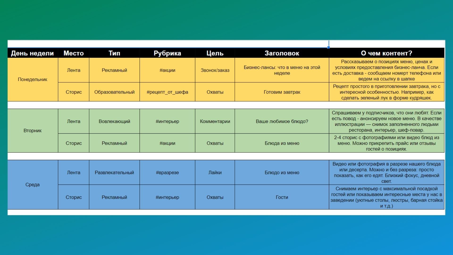 Мы подготовили на неделю для ресторана в гугл-таблицах. Просто скопируйте его к себе на аккаунт (Файл-Создать копию) и пользуйтесь. План гибкий – можете менять так, как угодно.