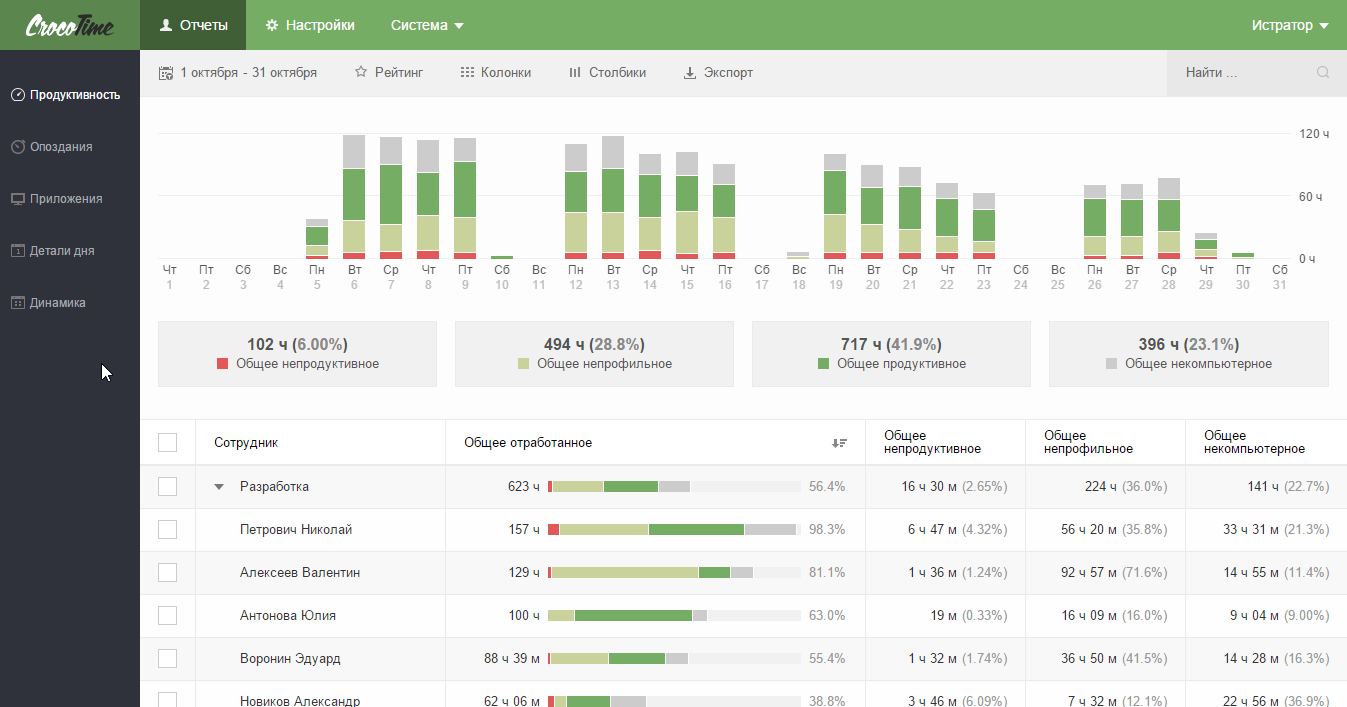 Для того, чтобы узнать, какой процент рабочего времени сотрудник потратил на решение бизнес-задач, а сколько «прокрастинировал» на развлекательных ресурсах, помогает сервис CrocoTime. На основе собранных данных он высчитывает коэффициент продуктивности каждого сотрудника, а также предоставляет руководству отчеты о том, какие ресурсы отнимают у работников больше всего времени.