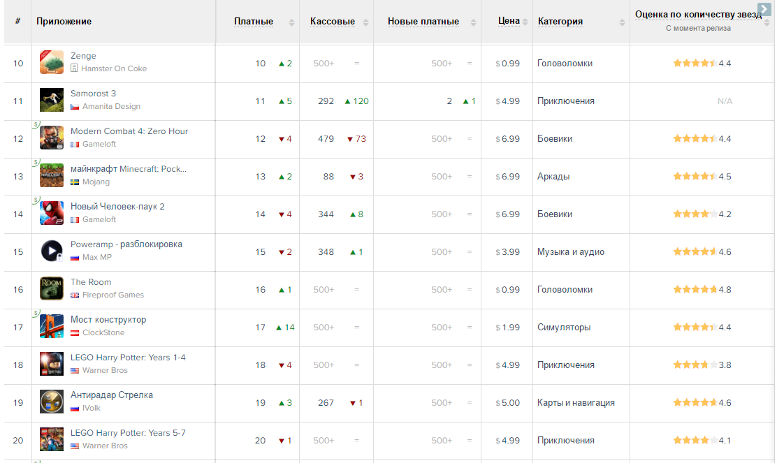 Как и в App store, в Google Play на первых местах — социальные приложения и игры, в основном головоломки. Пользователи Android охотно приобретают приложения для персонализации. Во второй десятке — игры и головоломки, две из которых популярны у подростков.