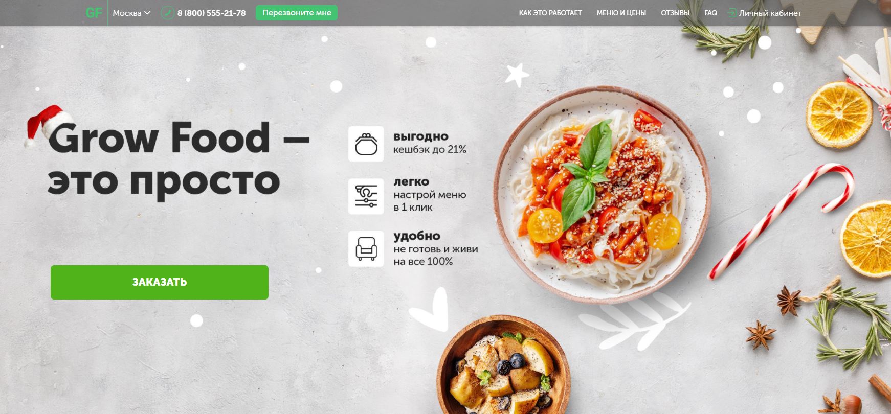 Компания на рынке с 2015 г. Специализация Grow Food – диетическое и спортивное питание. Сервис заявляет, что их вкусные рационы питания позволяют быстро худеть без вреда здоровью. Под СПб и Москвой работают два продуктовых завода компании. Есть бесплатная услуга — доставка готовой еды заказчикам на дом.