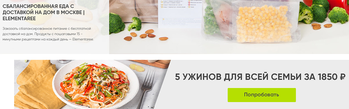 У Elementaree есть конкурентное преимущество: вам доставляют наборы из свежих продуктов, которые вы можете быстро приготовить сами. То есть, не воспользоваться готовым вариантом обеда в контейнере, заявленным в меню, а скорректировать или доработать рецепт под свои вкусы в процессе приготовления еды, если в душе вы немножко повар.