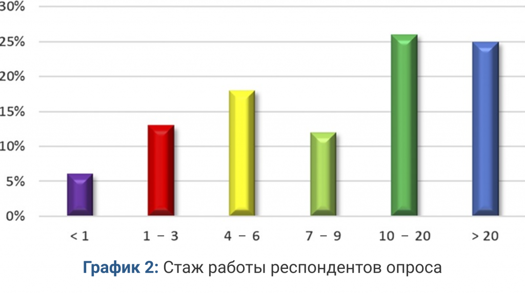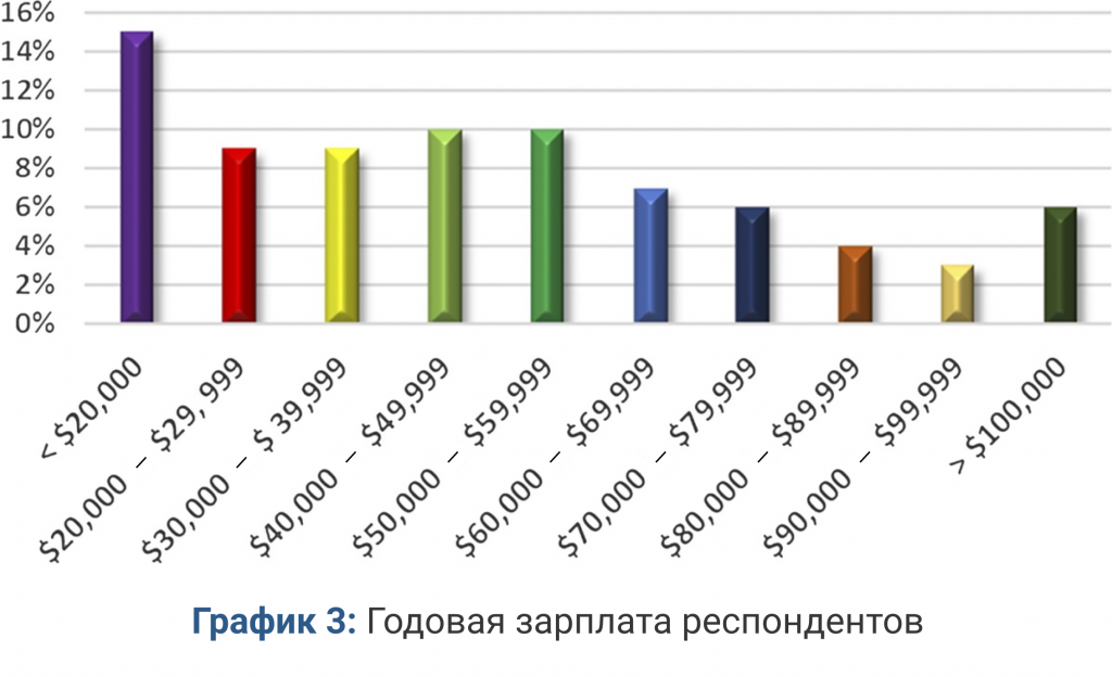 Мы получили ответы со всех континентов и изо всех стран, включая Австралию, Бразилию, Канаду, Китай, Францию, Германию, Японию, Индию, Италию, Россию, Сингапур, Сербию, Соединенное Королевство, США и др. Демографический срез опроса показал, что 60% респондентов были женщинами (40 — мужчинами) и принадлежали разным возрастам (график 1), причем 51% всех респондентов имели более 10 лет опыта в индустрии (график 2) и 25% — 20 лет. Более чем 36% опрошенных зарабатывали в год более $50 000, при этом 6% зарабатывали по меньшей мере $100 000 в год (график 3). Респондентов просили определить род деятельности (таблица 1), и 20% указали, что работают в качестве персональных тренеров либо на полную занятость, либо на частичную. В графике 4 отображено, что 33% респондентов указали, что ведут частную практику или владеют собственным бизнесом. На графике 5 отображен широкий спектр сертификатов, которыми обладали респонденты (38% сообщили, что не имели сертификатов вообще). 62% указали, что работают на полную ставку, а 29% — на неполную (менее 20 часов в неделю).