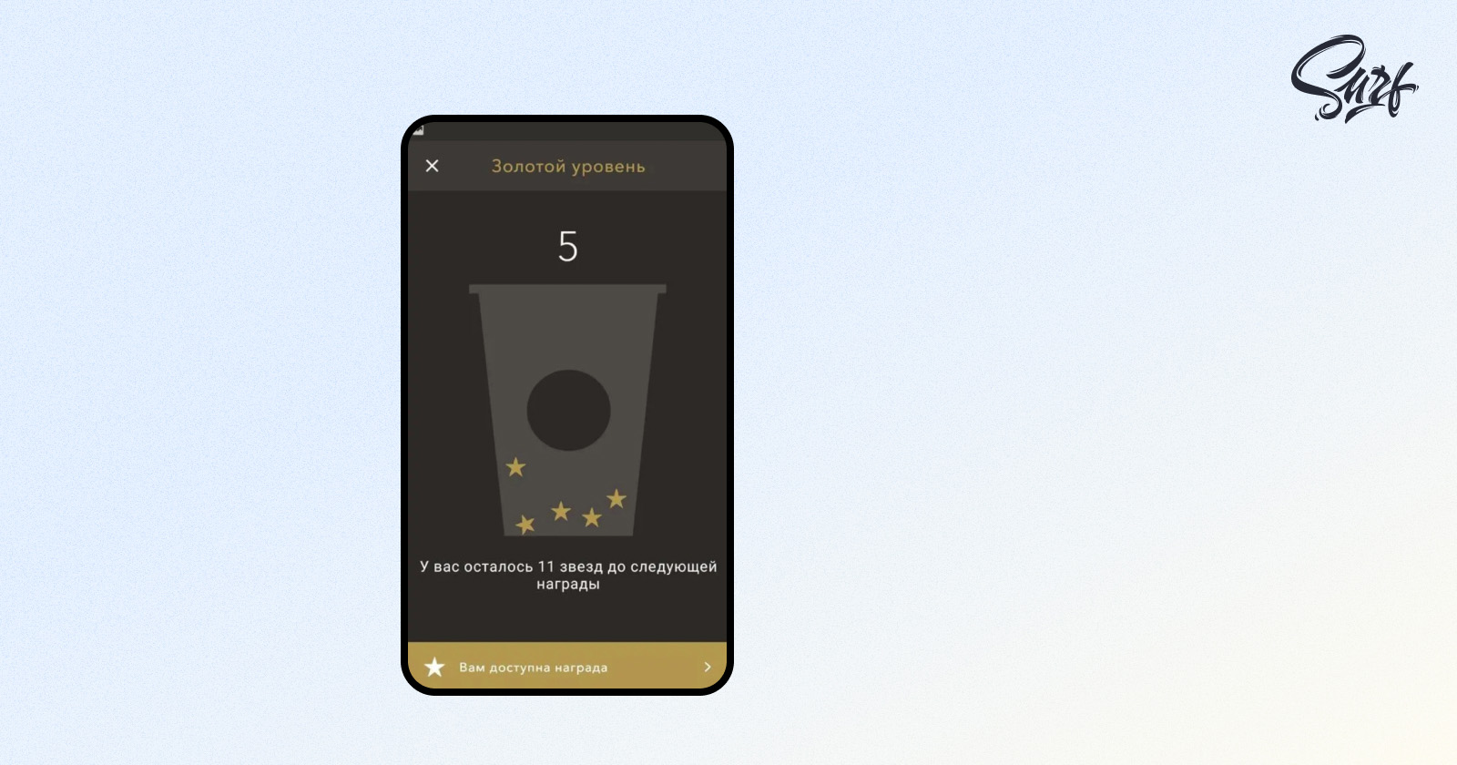 Ещё один пример программы лояльности в мобильном приложении — Starbucks. За каждый напиток покупатель получает звезду; звёзды можно менять на бесплатные напитки, десерты или брендированные подарки. Также в своём приложении Starbucks делает клиентам персональные предложения — запоминает заказ и подбирает подходящий десерт.