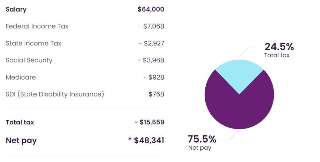 Для примера возьмем зарплату 64 000 долларов в год в Штате Нью-Йорк, и получится:
