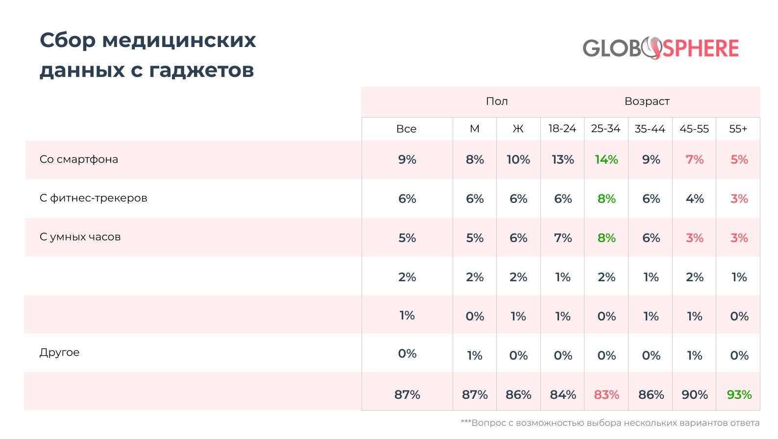 При этом информацию о своём здоровье с умных гаджетов собирает каждый восьмой представитель аудитории. В основном пользователи умных гаджетов — это люди 25–34 лет. Чаще всего информацию предпочитают собирать с помощью смартфонов и фитнес-трекеров. Люди, следящие за данными со своих гаджетов — ядро целевой аудитории электронных медицинских карт: у них уже есть привычка собирать и обрабатывать информацию о здоровье, но им не хватает надёжного инструмента, который мог бы собрать всё воедино.