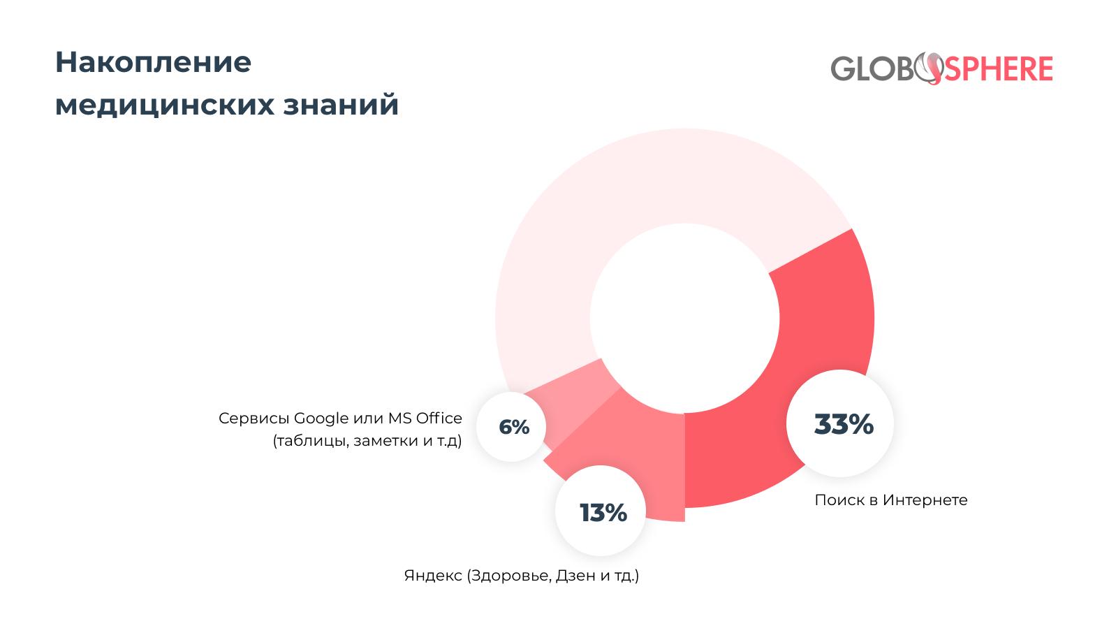 Вообще сёрфинг в сети — самый привычный способ получения и накопления медицинских знаний. На втором месте сервисы Яндекса (Здоровье, Дзен), далее — Google или Microsoft Office (таблицы, заметки и другие офисные программы).