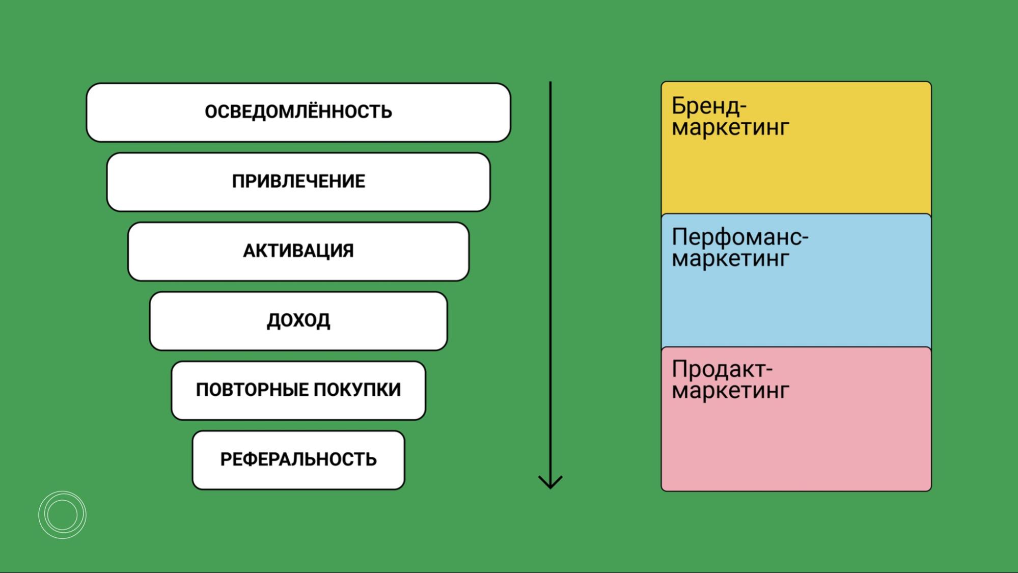 Маркетинг — это колоссальные возможности. В этом многообразии легко растеряться и выбрать не те инструменты. Основные подходы, направленные на рост стартапа — это бренд-, перфоманс- и продуктовый маркетинг. Каждое направление отвечает за реализацию определённой стадии воронки продаж: осведомлённость → привлечение → активация → доход → повторные покупки → реферальность.
