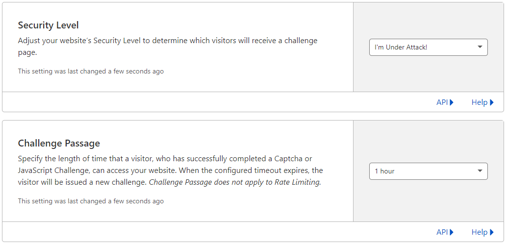 Вместо I’m Under Attack можно выбрать режим защиты High. В таком случае Cloudflare будет проверять не всех пользователей, а только тех, с чьих адресов в последние 14 дней было зафиксировано странное поведение — например, попытки зайти в чужие аккаунты или сбор данных со страниц сайта.