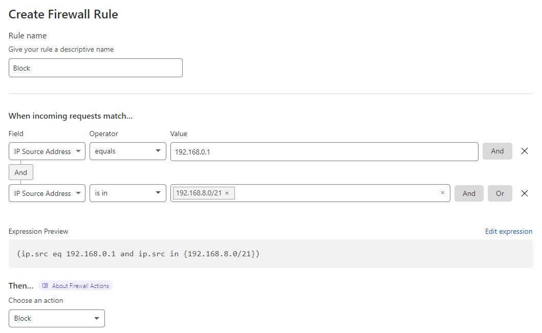Это очень простое правило. Давайте его усложним, добавив еще условие. Например, мы знаем не только «плохой» IP-адрес, но и диапазон IP-адресов злоумышленников. Его можно добавить к правилу с помощью кнопок And и Or.
