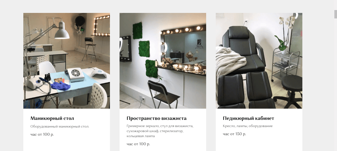 Предоставляются места для маникюра, педикюра, визажа, а также свободный кабинет с кушеткой, место для проведения мастер классов. Из необычного – услуга бьюти-девичник. Суть заключается в том, что девушка бронирует место и вместе подругами получает комплекс бьюти-процедур салона.