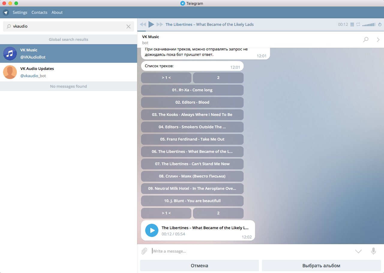Скачивание музыки из «Вконтакте» — вечно актуальная тема. И конечно же, для этих целей существует бот. Он через API подключается к «Вконтакте» и запрашивает доступ к аудиозаписям. Подтвердив, можно жать кнопку «Мои аудиозаписи» и листать страницы с треками. Бот позволяет посмотреть добавленные альбомы (кнопка «Выбрать альбом») и плей-листы. Файлы можно скачивать или слушать прямо в «Телеграме». К сожалению, в версии Telegram для iOS бот заблокирован.