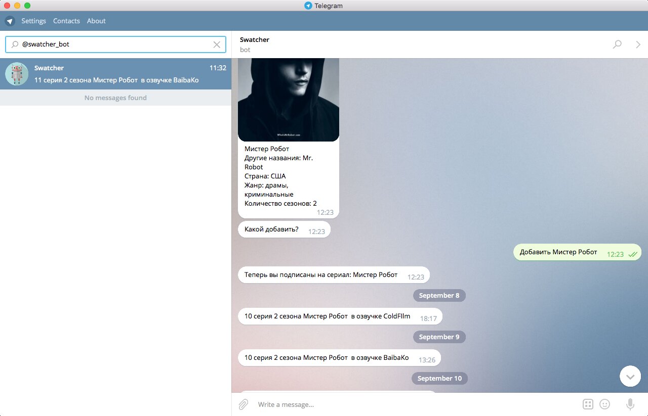 Если ты подсел на какой-нибудь идущий сейчас зарубежный сериал и хочешь знать, когда уже наконец выйдет новая серия, добавляй себе @swatcher_bot. Пишешь ему название сериала, он уточняет запрос и подписывает тебя на информацию о выходе новых серий. Когда какая-то из релиз-групп опубликует перевод, тебе поступит уведомление. Увы, подписаться на конкретную группу нельзя, так что о каждой серии ты будешь узнавать раза по четыре. Ссылок на скачивание тоже не дают.