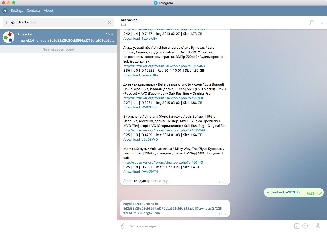 Многих других ботов можно обвинить в том, что они по функциональности не дотягивают до аналогичных сайтов. Но только не бот Rutracker.org! Это полноценная версия трекера, в которой можно искать (просто напиши запрос), сортировать выдачу (к примеру, команда отсортирует по количеству сидов, а — по размеру раздачи) и получать magnet-ссылки на торренты. Чтобы запросить magnet link, найди в выдаче под описанием интересующей раздачи ссылку вида и просто нажми на нее. Не хватает разве что возможности выбрать раздел для ограничения поиска.