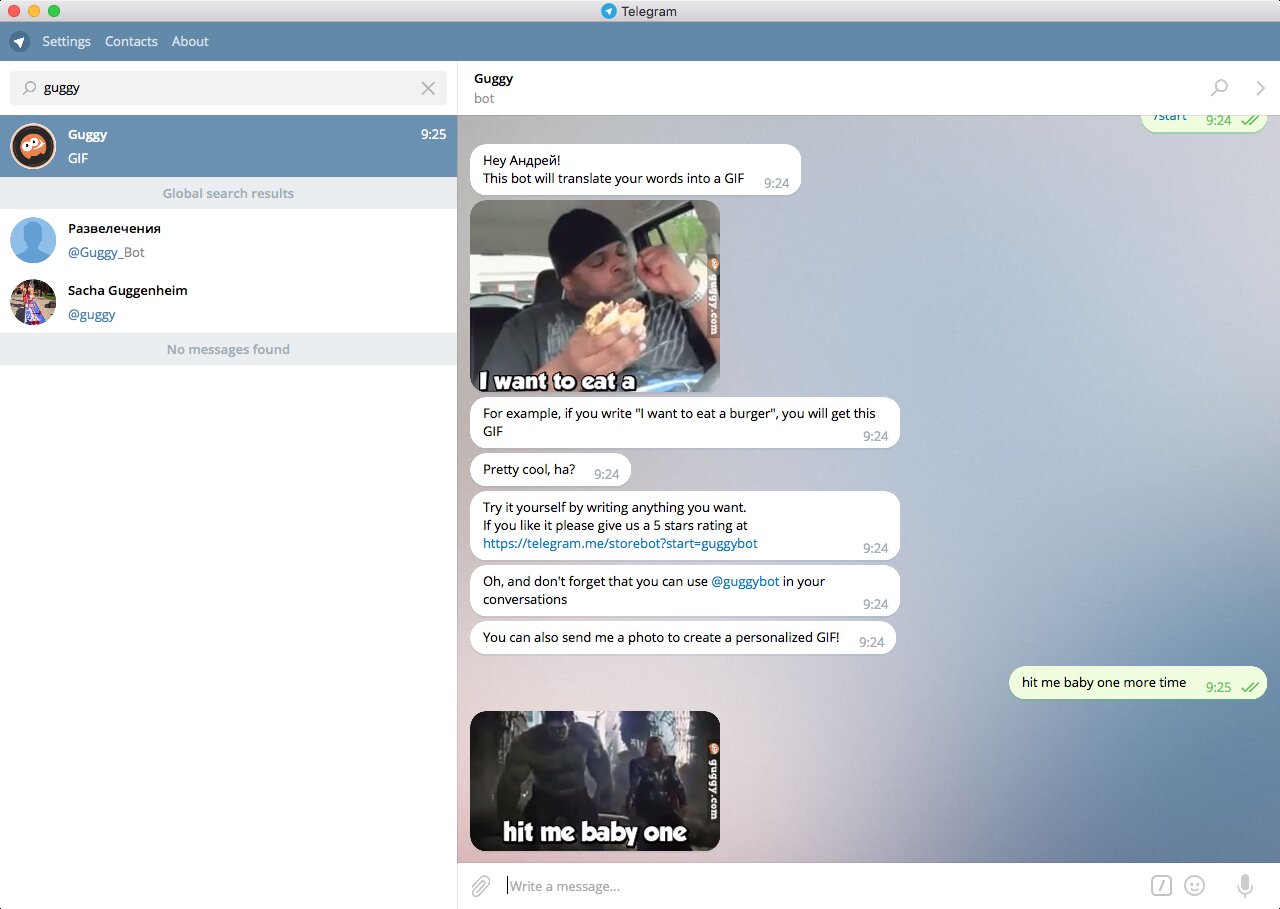Напоследок — чисто развлекательный, но интересный бот. Пишешь ему любую строчку, а он накладывает ее на анимированный GIF. Интересная особенность заключается в том, что гифка обычно имеет некоторую связь с тем, что написано, причем даже если писать по-русски. Польза, конечно, сомнительна, зато весело.