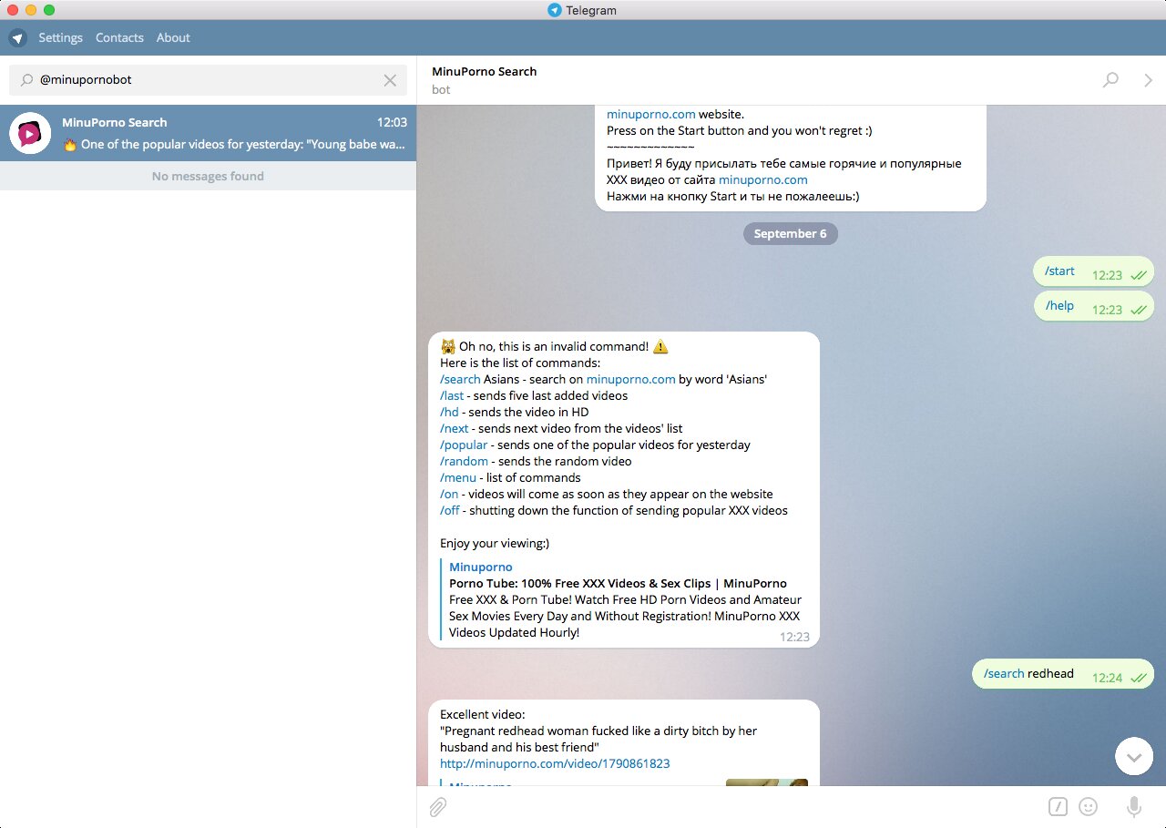 Без ботов, поставляющих порнографию, наш список был бы неполным, тем более что @minupornobot гордо занимает первое место в рейтинге «Телеграма». Принцип прост: командой можешь искать ролики по ключевым словам, команды и выдают наиболее популярное или случайное видео соответственно. Еще бот дважды в день шлет ссылки самостоятельно — так сказать, для поддержания либидо. Если боишься, что кто-нибудь случайно увидит уведомление, скажи боту , и он прекратит безобразие. Изначально, кстати, мы хотели вместо него порекомендовать @Pornhub_Bot, но Роскомнадзор вовремя подсуетился и перекрыл в России доступ к PornHub. К сожалению, бот не заменяет сайт, а лишь шлет ссылки на него.