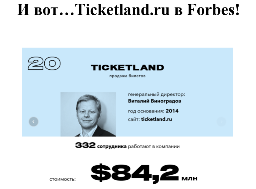 Все поставленные задачи были решены. Сервис Ticketland вошел в двадцатку Forbes, компанию оценили в 84,2 млн долларов. Для бизнеса такого рода это отличный результат.
