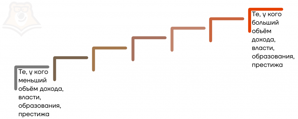 Когда же речь идет о социальной стратификации, то ее можно изобразить в виде социальной лестницы. И тут уже нужно учитывать, что ступеньки лестницы показывают разное положение групп/индивидов/страт в обществе, то есть кто-то находится выше, а кто-то – ниже.