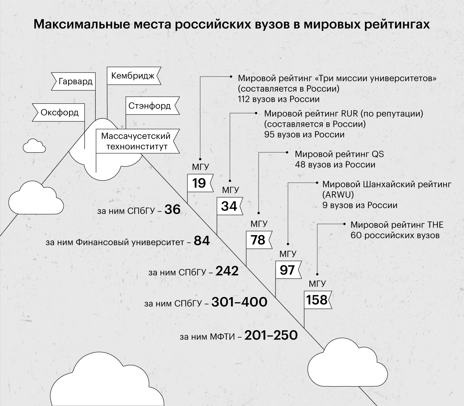 В этом году результаты российских вузов в ряде самых престижных международных рейтингов оказались лучше, чем в прежние годы. Так, в последний QS World University Rankings вошли 48 российских вузов — на 16 больше, чем год назад. По представленности в рейтинге Россия оказалась на четвёртом месте — впереди США со 177 университетами, Великобритания (90) и Китай (58).