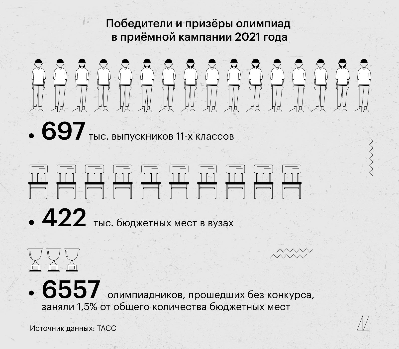 В 2021 году приёмная кампания прошла с очень высокой конкуренцией (напомним: её провели по изменённым правилам — конкурсные зачисления прошли в одну волну, а не в две). Бюджетные места на самых популярных программах в самых престижных университетах в основном заняли победители олимпиад. В некоторых вузах из-за этого мест не хватило даже супербалльникам по ЕГЭ. После этого глава Минобрнауки Валерий Фальков предложил ужесточить требования. В результате, согласно новым правилам приёма в вузы, победителям олимпиад немного ограничили льготы. Но так ли много олимпиадников в масштабе общего количества выпускников школ? Как показывают цифры, на самом деле причина скорее в высокой концентрации олимпиадников среди абитуриентов конкретных топовых вузов и в малом количестве бюджетных мест на наиболее популярных направлениях.