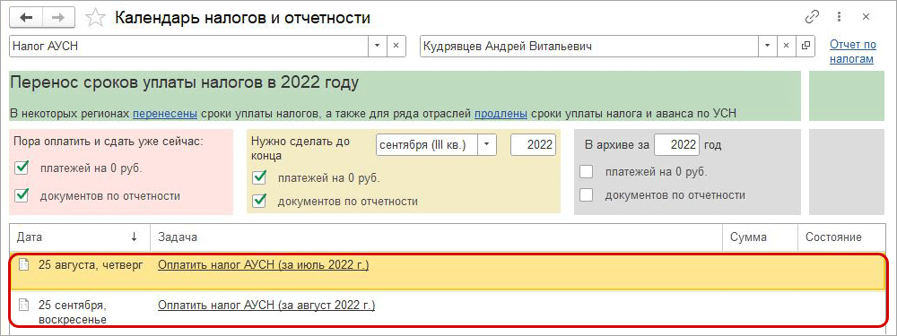 В календарь налогов и отчетности добавлены задачи по оплате налогов АУСН. При расчете налога по сотрудникам учтены тарифы АУСН: только оплата взноса от несчастных случаев на производстве и профзаболеваний.