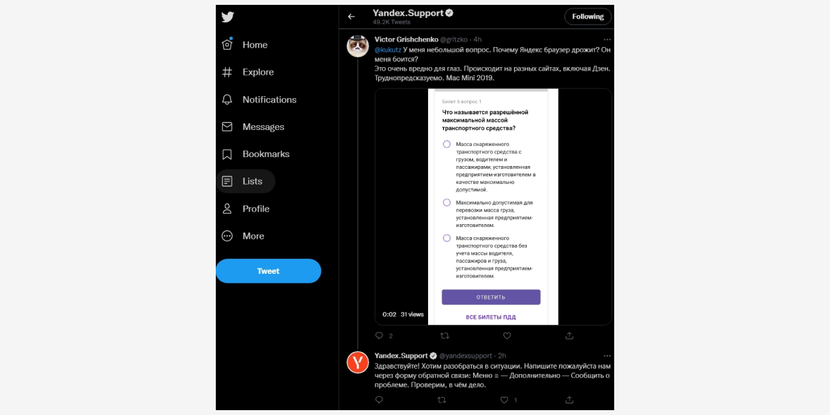 Яндекс создал учетную запись в Твиттере специально для обработки запросов на обслуживание клиентов и решения их проблем, связанных с продуктом компании.