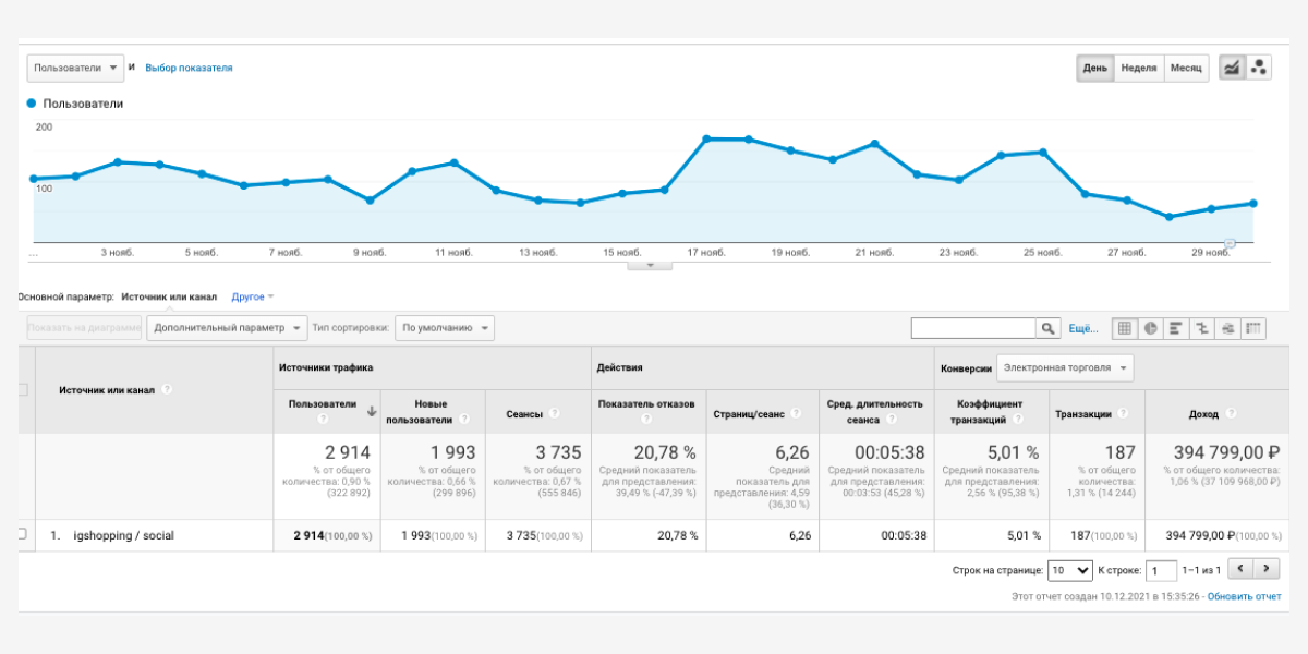 Пример дохода от шопинг-тегов в Google Analytics по метке