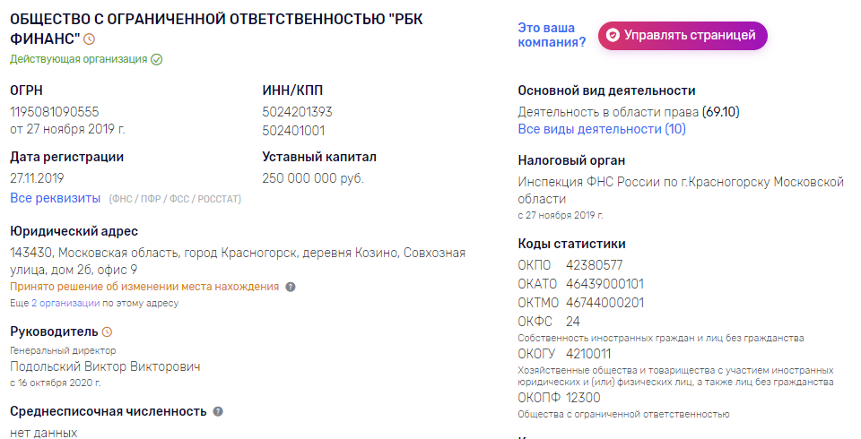 Холдинг с уставным капиталом в 250 миллионов рублей прописан в деревне Козино (Совхозная улица, дом 2б, офис 9), а его руководителем с 16 октября 2020 значится некий Подольский Виктор Викторович.