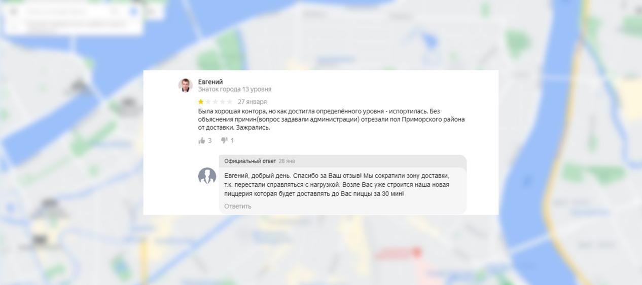 Помните, что даже в самой критической ситуации вы обязаны оставаться вежливыми со своими клиентами. Поэтому постарайтесь не реагировать на оскорбления: негативный отзыв – это инструмент, с помощью которого вы можете выявить проблему. На примере ниже проблема уже решилась – новая пиццерия в стадии постройки, и представитель компании говорит клиенту об этом. Вежливым и официальным тоном!
