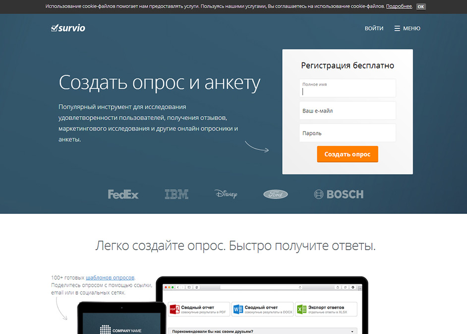 Один из наиболее популярных инструментов для исследования настроений пользователей, сбора отзывов для маркетингового исследования, рассылки онлайн-опросов и анкет. Имеет 100 готовых шаблонов, оформленных в разных стилях. Для создания опроса достаточно несколько кликов мыши, но если необходимы данные для серьезного исследования, лучше приобрести базовую версию. Данные и полученные ответы можно просматривать в режиме реального времени в виде графиков, таблиц и файлов в формате pdf. Интерфейс простой и понятный. Даже если вы никогда не занимались подготовкой опросов и анкет, легко справитесь. Онлайн инструмент работает на всех платформах и браузерах. Безопасность гарантирована 2048-bit SSL шифрованием ISO/IEC 270001. Создатели гордятся, что пользователю ничего не нужно скачивать и устанавливать. Добиться успеха легко, если у вас устойчивый сигнал и отличный wi-fi. Survio ориентирован на социальные сети – пользователи могут бесплатно размещать анкеты на своих сайтах или на страницах в Facebook.