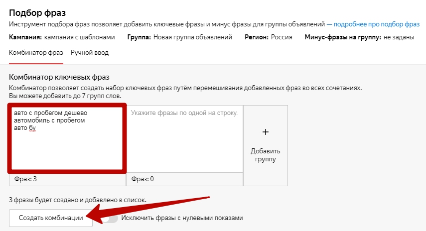- Такой алгоритм срабатывает, если ключевая фраза содержит не более 33 символов (с пробелами, но за исключением минус-слов и операторов + и !). Иначе пользователь видит в объявлении вариант по умолчанию. Подробнее – далее в статье;
