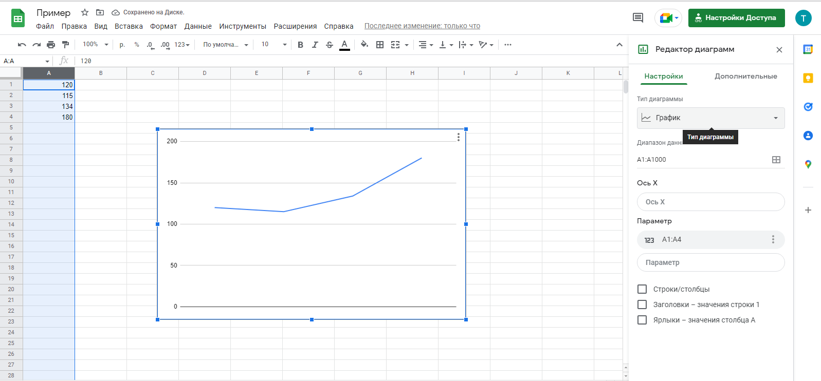 В правом меню откроется редактор диаграмм, в котором можно задать нужный внешний вид, поменять диапазон данных и приоритетные оси. Также вы можете поменять тип диаграммы. Помимо столбчатой, здесь предусмотрены лепестковая и линейная диаграммы. Также Google Таблицы поддерживают большое количество графиков и иных типов диаграмм (например, карты и отображение различных показателей по странам).