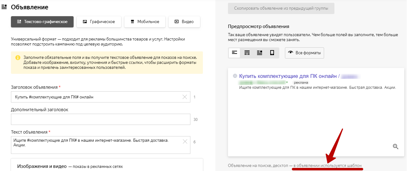 Директ отмечает под блоком предпросмотра, что объявление содержит шаблон.