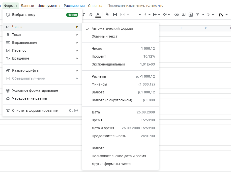 Изменить формат можно с помощью соответствующей вкладки в главном меню. Пользователям доступны округление, разные варианты отображения даты и времени, в том числе и пользовательские. Для текстовых данных доступно выделение текста полужирным шрифтом, курсивом, зачеркнутым шрифтом. Есть функция выравнивания в ячейке: по центру, по левому или правому краю, а также направление текста (сверху вниз или снизу вверх, по диагонали).