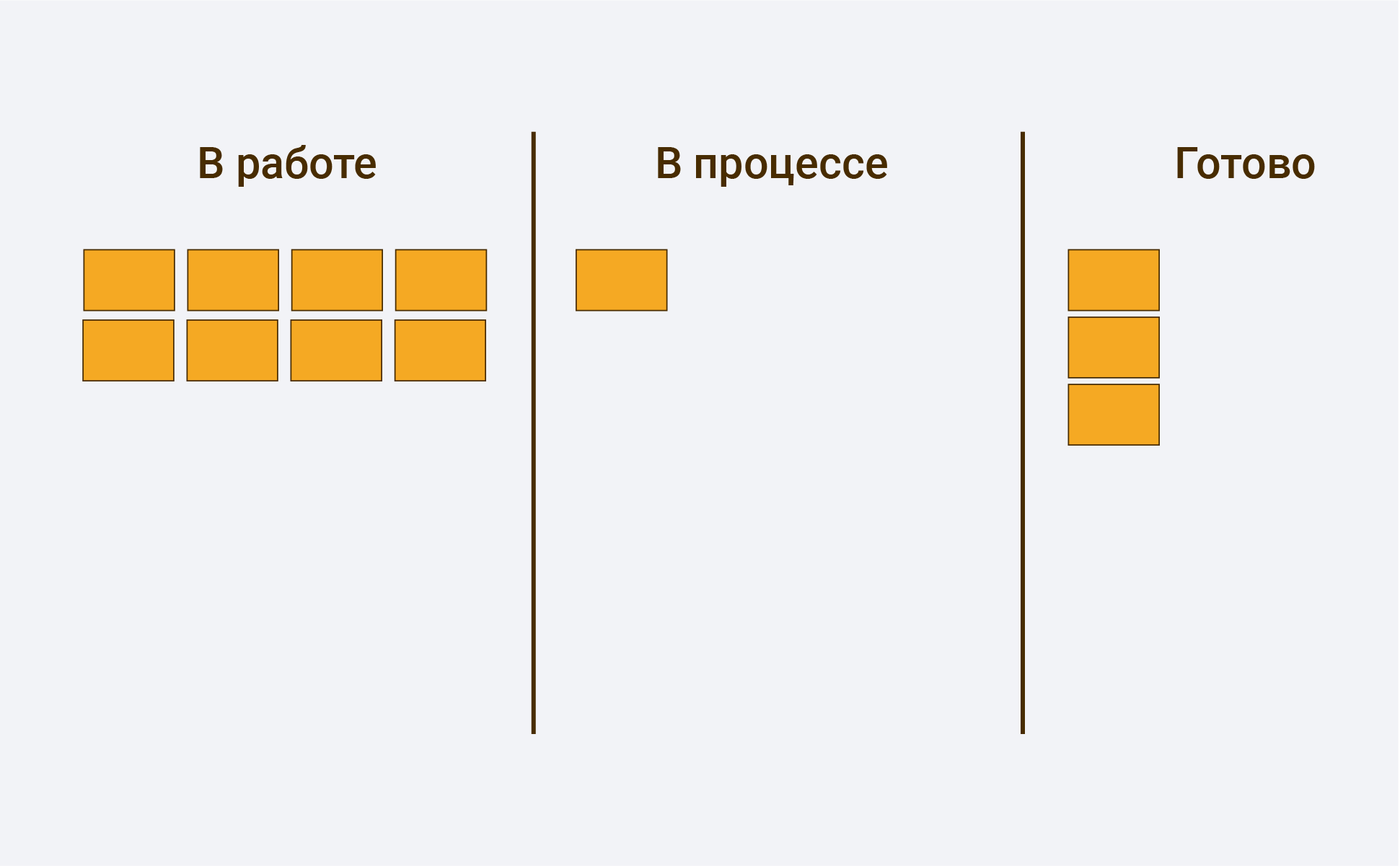 Scrum-команда вешает в помещении для совещаний доску с разноцветными стикерами. Она делится на части, где отражается весь процесс работы над проектом. Тут могут быть варианты, но обязательно присутствуют три части. Первая — «Что нужно сделать», вторая — «В работе», третья — «Сделано». Этот простой способ помогает всем членам команды следить за общим ходом работы.