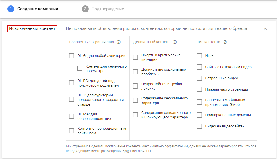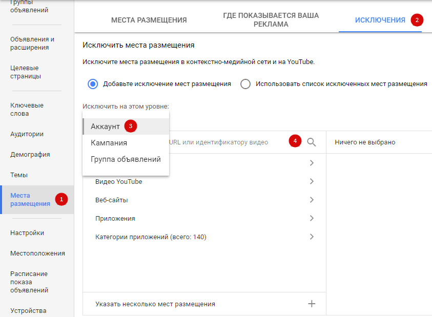 Дополнительно можно определить, где пользователи не увидят вашу рекламу. Для этого исключите из показов нежелательные места размещения на уровне аккаунта (только на уровне аккаунта!) :