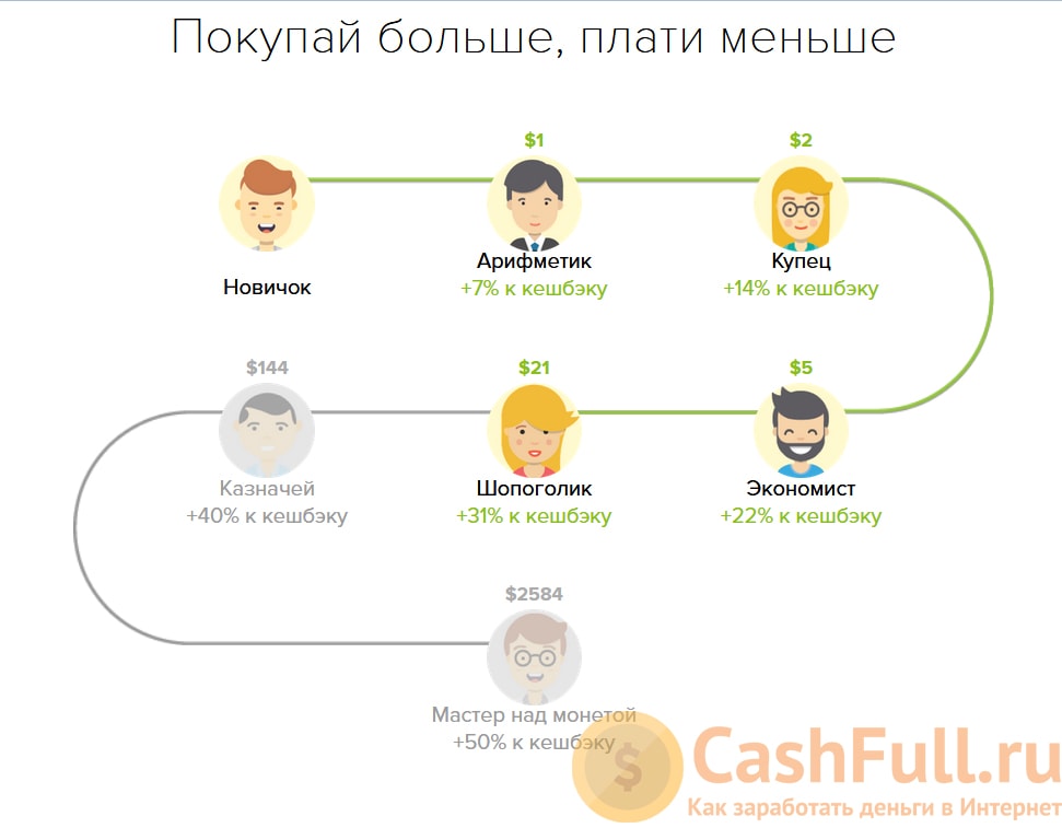 Система бонусов, как у Letyshops, уровневая. Арифметик: 1 доллар – плюс 7 процентов. Купец: два доллара – 14,49 %. Экономист: пять долларов – 22,5. Шопоголик: 21 – 31,07 процентов. Казначей: 144 – 40,25. Мастер над монетой: 2584 – 50,07.