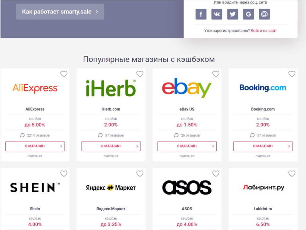 Каждый из магазинов-партнёров Smarty.Sale имеет свою персональную страницу, на которой размещена вся необходимая информация: