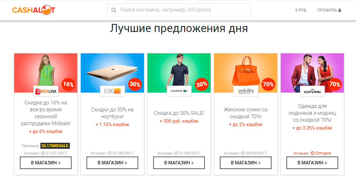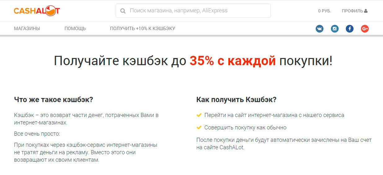 CashALot предоставляет своим клиентам возможность вернуть до 35% от стоимости товара. Через CashALot покупатели, желающие сэкономить, могут совершать покупки во многих популярных магазинах-партнерах: AliExpress, Rozetka, GearBest и т. д.