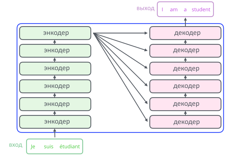 Спустимся на уровень ниже: энкодер и декодер в стандартном трансформере содержат по шесть слоев, то есть наборов математических операций. Эту цифру разработчики подобрали опытным путем, ее можно увеличивать.