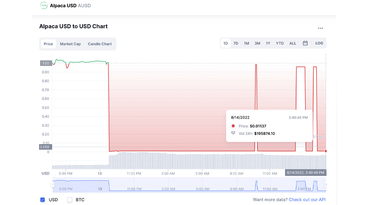 В то время как USTC Терры так и не восстановил привязку к 1 доллару, USDN, MIM и USDD обмениваются по 0.99 доллара за монету 14 августа 2022 года. Однако в тот же день стейблкоин на основе Polkadot альпака доллар США (AUSD) потерял свою привязку. Данные coinmarketcap.com показывают, что в воскресенье был зафиксирован исторический минимум в размере около 0.006383 доллара за единицу. Во время написания этого поста в 3:15 (EST) цена AUSD вернулась к диапазону 0.95 доллара, но затем быстро упала до 0.01165 доллара в кратчайшие сроки.
