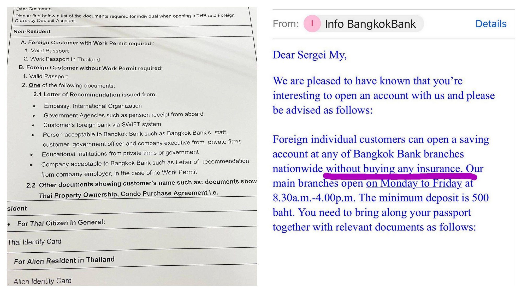 Согласно пункту правил 2.1 Bangkok Bank, для получения их карты нужно предоставить справку о любом другом открытом счете — подойдет справка от «Тинькофф». Страховку покупать не обязательно, даже если специалист банка будет сильно на этом настаивать — вот скрин официального ответа от банка