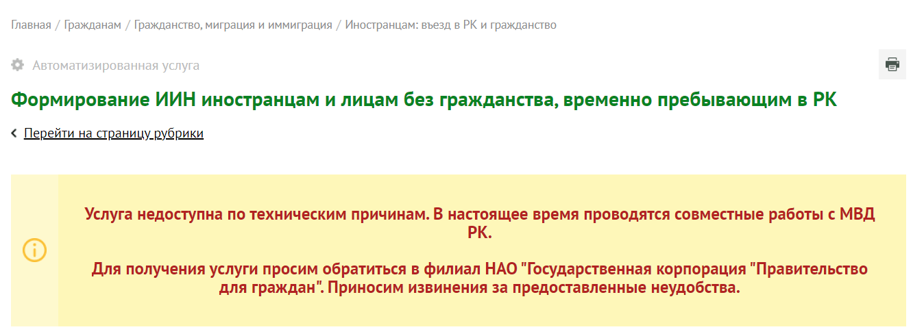 Раньше в ЦОН можно было записаться заранее через интернет, но в конце мая онлайн-запись на «формирование ИИН для иностранцев» была приостановлена. Изначально на портале правительства Казахстана срок возобновления доступности услуги указывался как «1 октября 2022», но сейчас никаких дат нет, а услуга недоступна по техническим причинам.