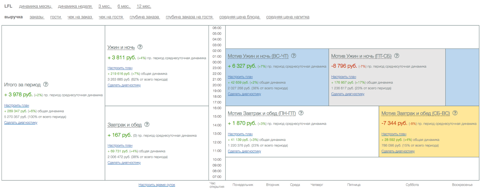 Как видим выше — выручка обманчивый показатель, она в целом по ресторану растет, но на самом деле мотивы ужин пятницы и субботы, а также завтраки выходных дней проседают.