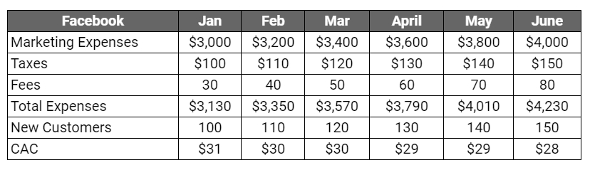 САС = (Marketing Expenses + Taxes + Fees) / New Customers