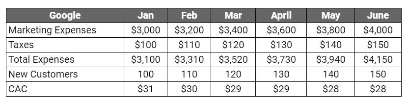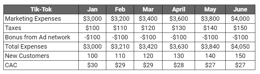 САС = (Marketing Expenses + Taxes — Bonus from Ad network) / New Customers