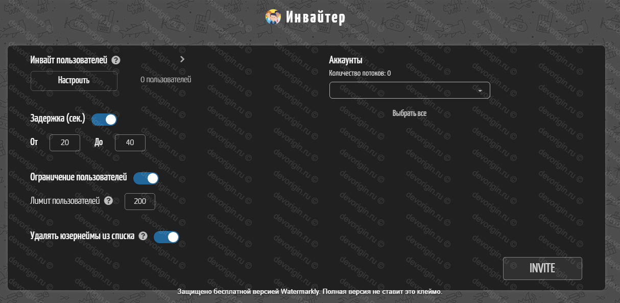 Не забывайте выдать права аккаунтам, которые будут выполнять инвайтинг в программе, с которых происходит инвайтинг. Если приглашаете в чат, то в нем не должно быть ограничений на приглашения. Минимальная пауза при инвайтинге 10-15 секунд.