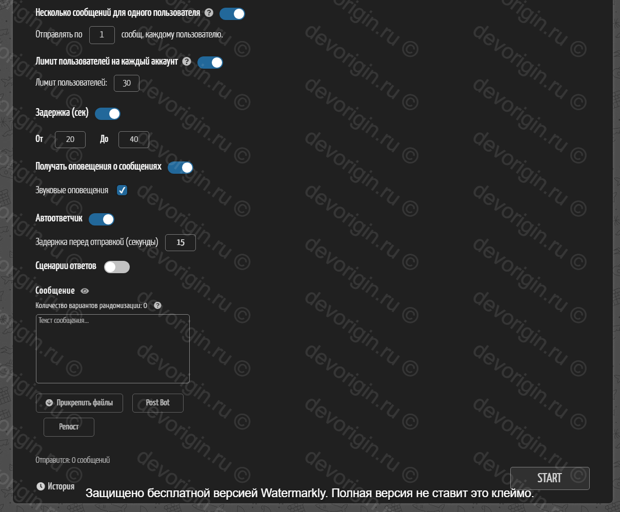 @username тоже считается ссылкой, поэтому периодически его меняйте. Все файлы и картинки, которые используются при отправке нужно иногда менять, даже ваш супер рандомизированный текст через время может заспамиться. Минимальная пауза при отправке — 10 секунд, но для новых аккаунтов указывайте ее больше, например от 30 сек. Без ссылки можно отправить до 40 сообщений с аккаунта за сутки, если в тексте есть ссылка, то не более 10. Обязательно используйте функцию «Чёрный список», тогда при следующих рассылках один и тот же человек не будет получать сообщение повторно.