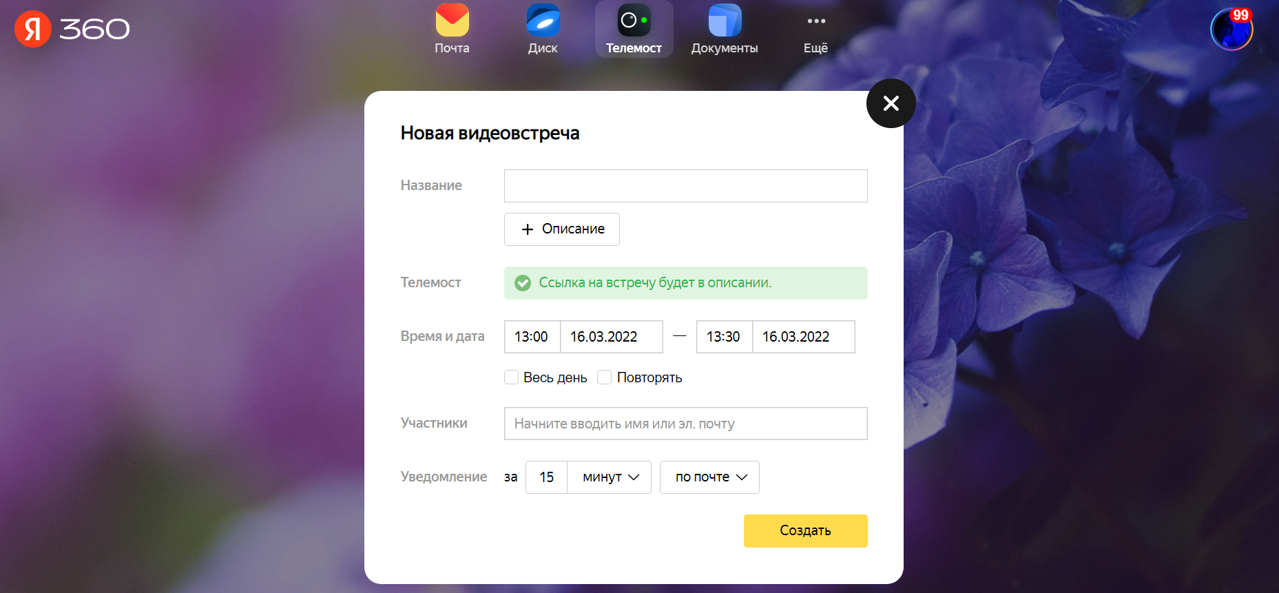 Российский сервис для онлайн-встреч. Позволяет работать из браузера или мобильного приложения, загрузить контент для демонстрации на конференции и настроить задний фон. Предлагает бесплатную и платную версии, находится в реестре отечественного ПО и имеет серверы в России.